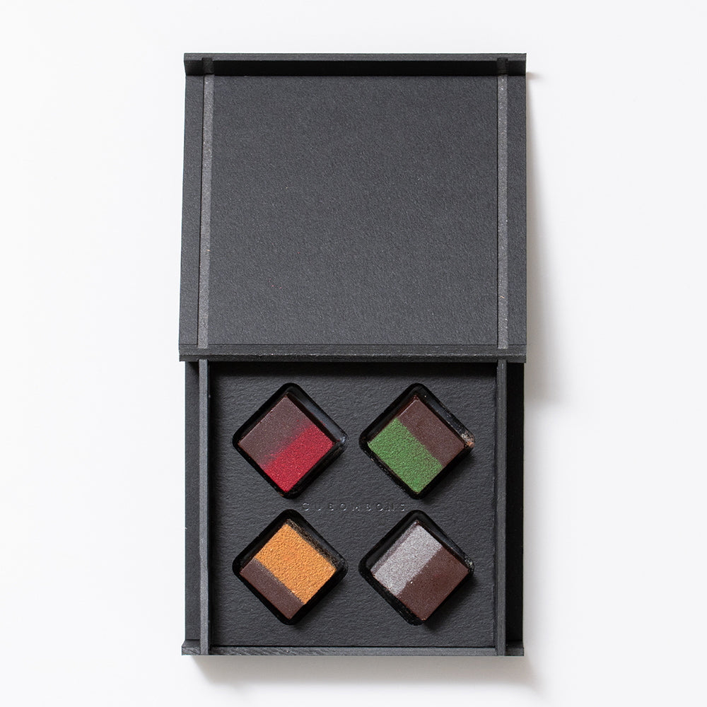■味わい深いリキュールが入った、キューブ型のボンボンショコラ4種セット。ウイスキー、ラム、テキーラ、日本酒を練り込んだ口どけなめらかなガナッシュと、ダークチョコレートの奥深さをお楽しみいただけます。 洗練されたデザインは、大切な方への贈り物や、ご自分へのご褒美にもぴったりです。
