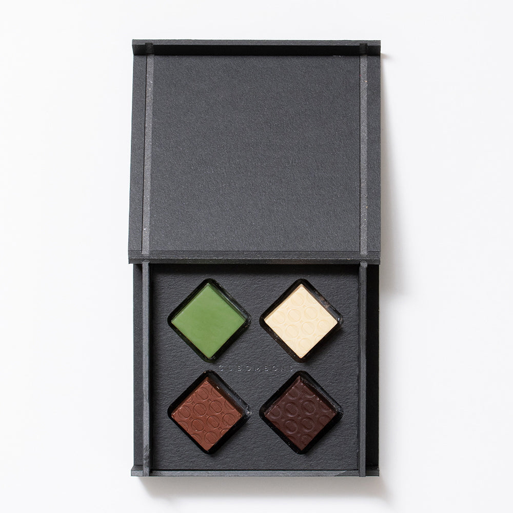 ■コーヒーやティーの香りを楽しめる、キューブ型のボンボンショコラ4種セット。 抹茶、アールグレイ、カプチーノ、コーヒーを練り込んだ口どけなめらかなガナッシュを、それぞれ相性の良いチョコレートに合わせました。素材本来のナチュラルな風味とチョコレートの奥深い味わいをお楽しみいただけます。 洗練されたデザインは、大切な方への贈り物や、ご自分へのご褒美にもぴったりです。