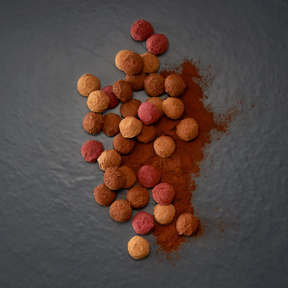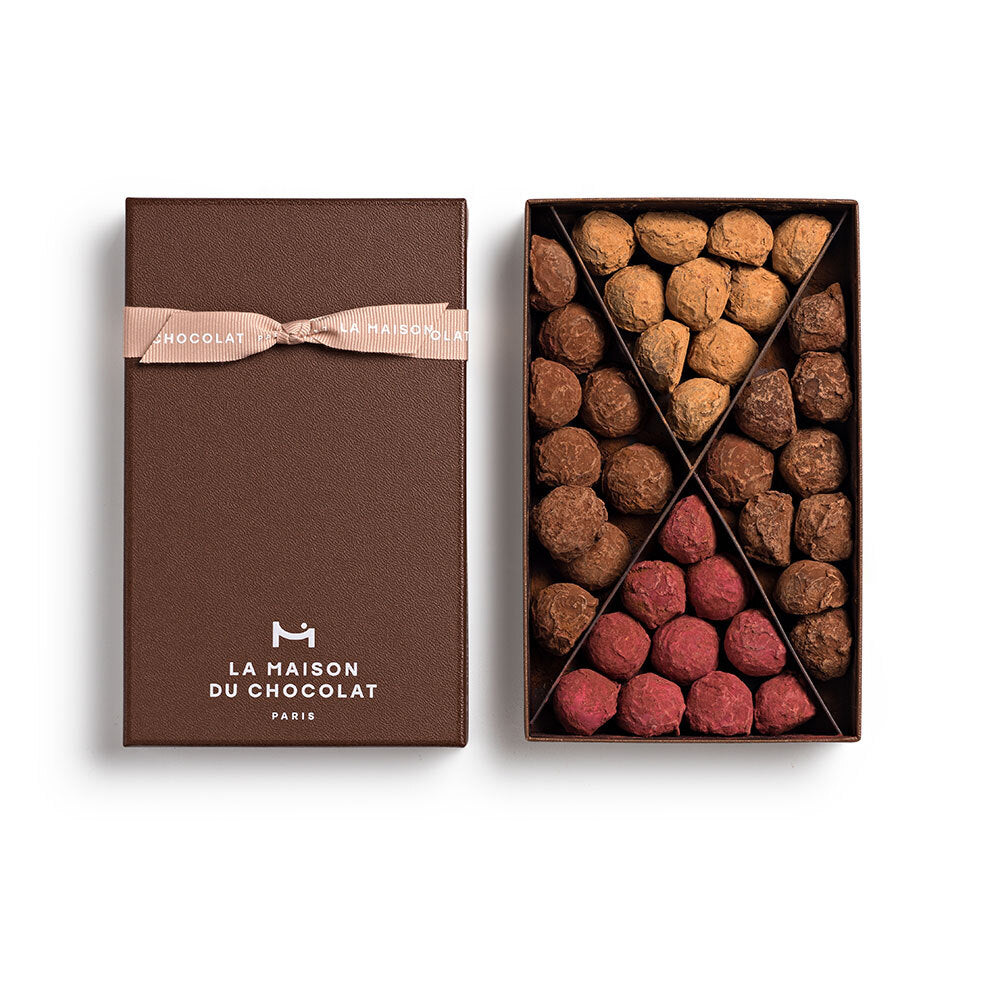 キャラメル風味、カシス風味、プレーンの3種のトリュフの詰合せ。